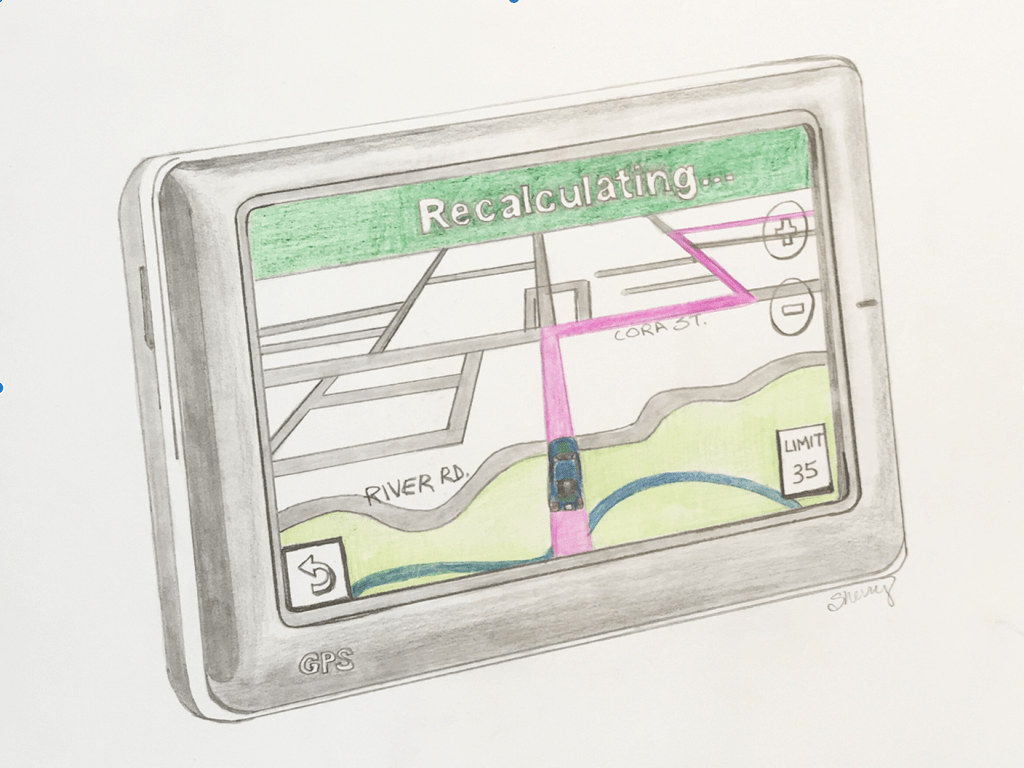 I vividly remember the first time I saw GPS (Global Positioning System) at work. I was at a family reunion in Tennessee and my uncle and I snuck off to play golf. He had a Garmin in his car and punched in the address of the golf course. Could that really work? A female voice began to tell us to turn left in 500 feet then go straight 3 miles. At one point we missed one of the turns. The device beeped once and her voice intoned, “Recalculating.” After a few seconds she directed us to “Turn left in 100 feet.” Well, we were already 100 feet further along and missed that turn off too. “Recalculating.” This happened a few times on our quest to find the golf course. It may have been my imagination but I sensed a certain edge to her voice after a couple of recalculations. Today this technology is much more advanced and came standard in my car.